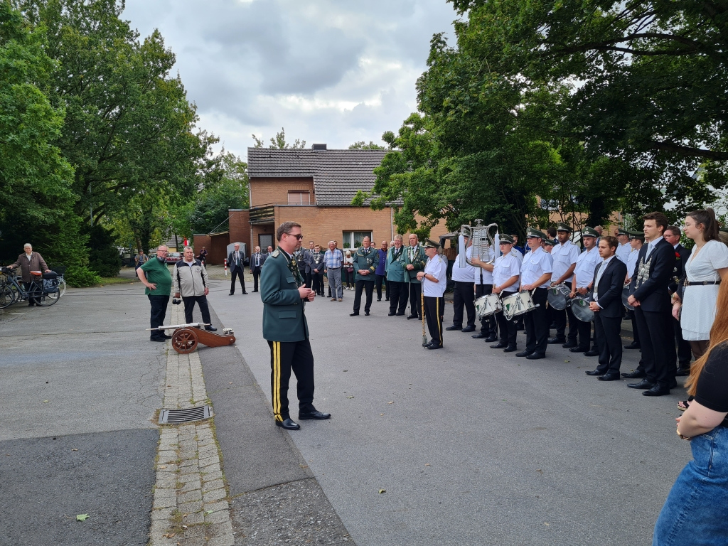 Das Schützenfest begann mit den Böllerschüssen und Glockengeläut. Eine Besonderheit in diesem Jahr war, daß neben den Königen Johannes I. Hamacher und Jungkönig David I. Engelbrecht, den Vorstandsmitgliedern und Ehrengästen auch die erste Bürgerin der Stadt Kaarst, Ursula Baum, den Abzug der Böllerkanone selbst betätigen durften.