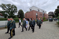 Anschließend stellten sich die Schützen auf, um auf dem Friedhof einen Kranz niederzulegen. Der Kranz wurde durch Jägermajor Hans Peter Weger und Grenadiermajor Thomas Hannen zum Friedhof getragen und durch den 1. Brudermeister Thomas Schröder und den 2. Brudermeister Franz Geers niedergelegt.